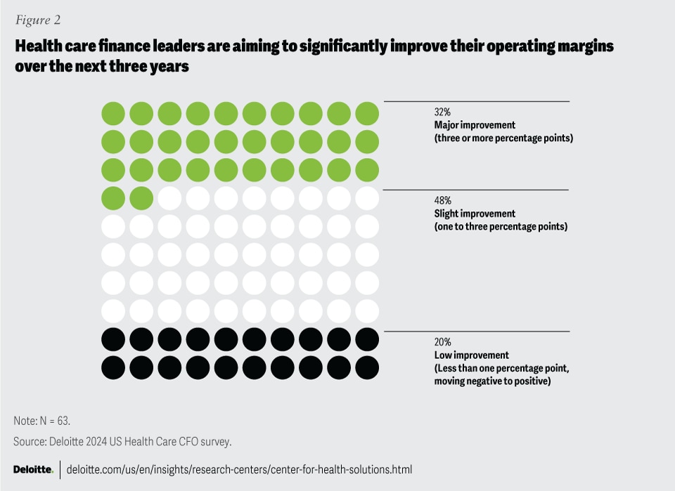 The health care industry has been experiencing a period of low profitability, with operating margins averaging 1% to 4% in the past five years for many organizations—and some even experiencing losses.5 To help achieve their organizations’ financial goals, finance leaders should implement new levers, technologies, or methods—and they should act quickly. If they fail to reach their margin goals, they might need to reduce their services and offerings, merge with or be acquired by another organization, or cut operational expenses to the point that it affects quality, which might conflict with their mission.6