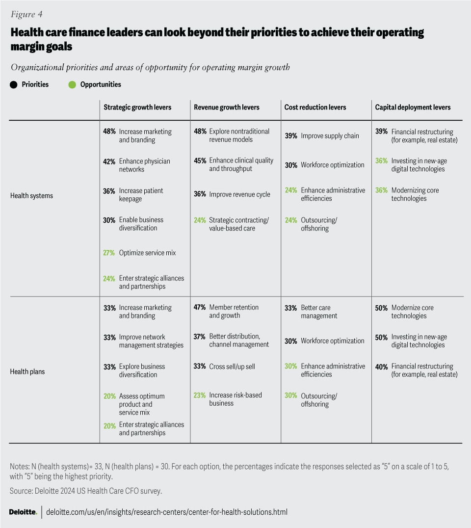 While health care finance leaders say they are focusing on multiple levers, some areas that could potentially have a larger impact on profitability may not have been receiving the attention they deserve (opportunities in figure 4). Levers that were chosen by fewer than one-third of the CFOs surveyed, yet have the potential to significantly improve their operating margins, include: