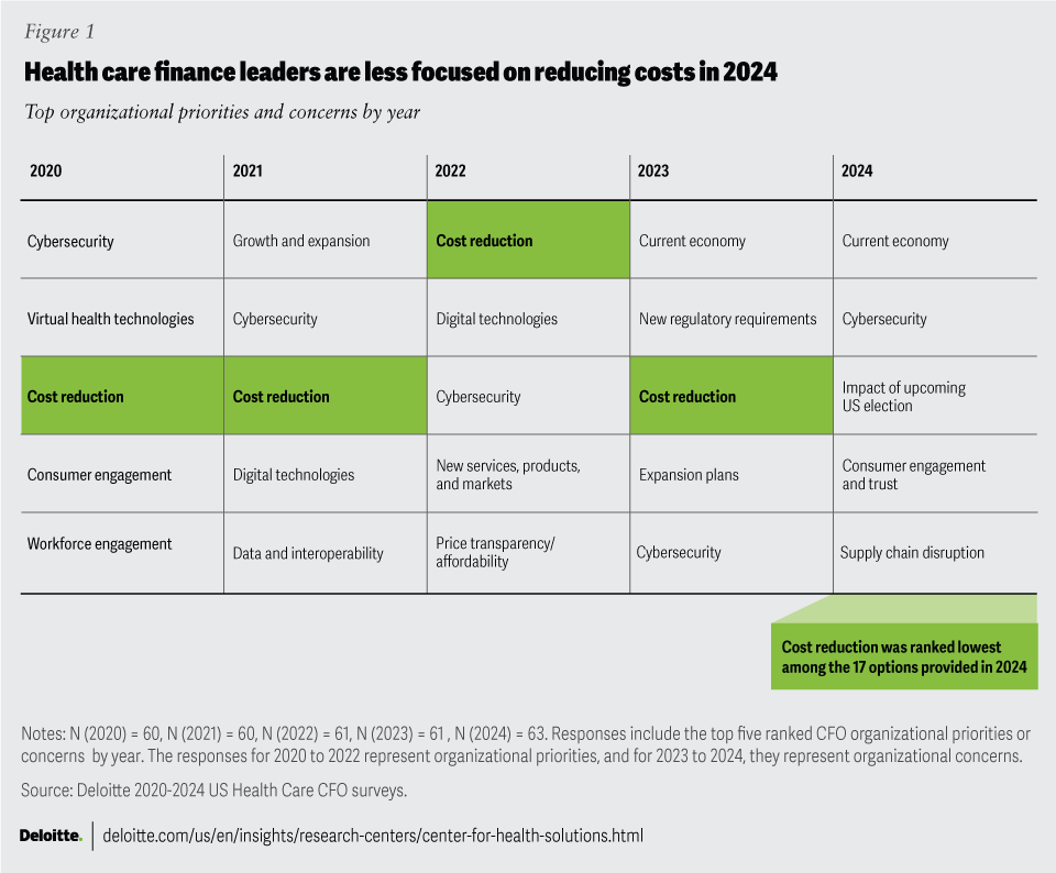 Deloitte’s survey of health care finance leaders, conducted by the Deloitte Center for Health Solutions annually since 2020, has consistently revealed cost reduction as one of the top three organizational priorities and concerns—until last year (figure 1). This raises the question: What is the role of cost reduction going forward, and where else can value come from?