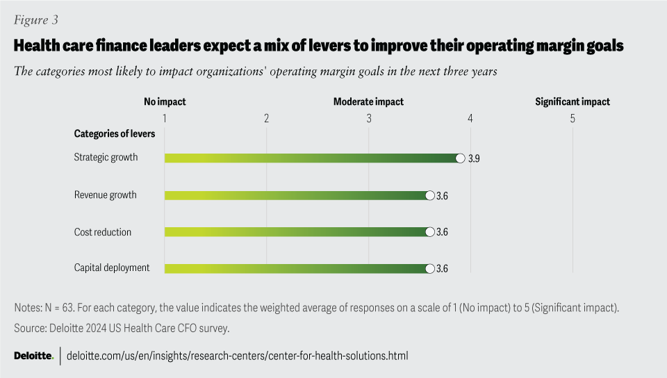 Health care organizations should adopt a more comprehensive approach to improving profitability. Many CFOs have expanded their margin enhancement strategies beyond cost reduction by embracing strategic growth, revenue growth, and capital deployment, albeit in different ways across organizations. Finance leaders should champion the continued broadening of their organization’s perspective and help prioritize investments based on expected returns, implementation costs, available funds, and time to value.